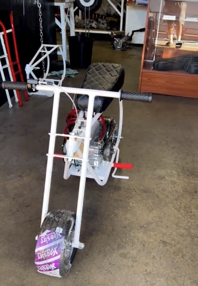 The Volts White Diamond is a clean, aggressive, performance-built minibike designed for riders who want a perfect blend of speed, durability, and premium styling. Featuring a custom white powder-coated frame and race-inspired components, this build is made to stand out while delivering serious performance.